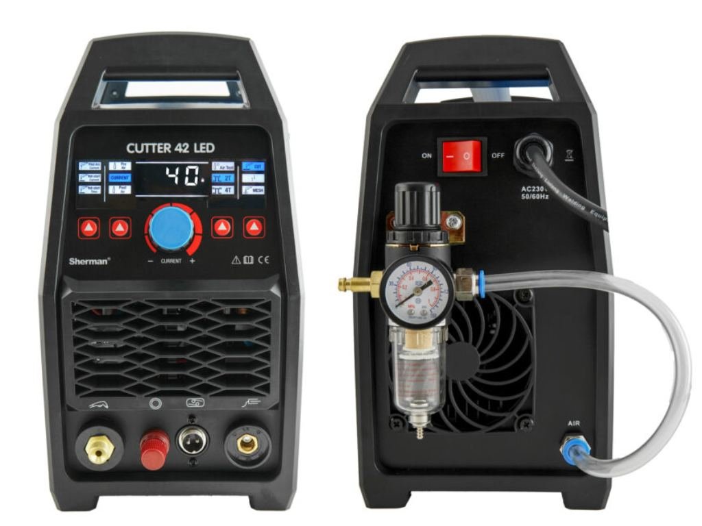 Plazmová rezačka Sherman CUTTER 42 LED je moderné, digitálne riadené zariadenie na plazmové rezanie vzduchom určené na rezanie uhlíkovej ocele, nehrdzavejúcej ocele, hliníka a medi. Ideálne sa hodí do výrobných prevádzok so strednou intenzitou rezania, ako aj do servisných a remeselných dielní.