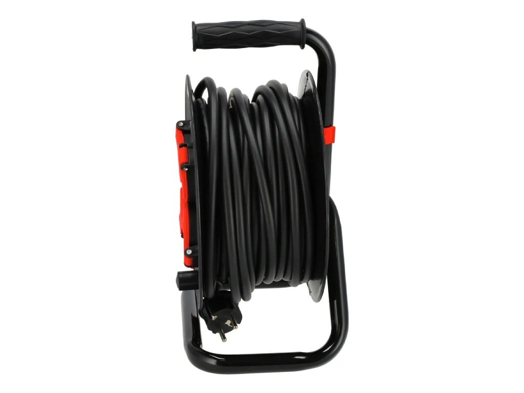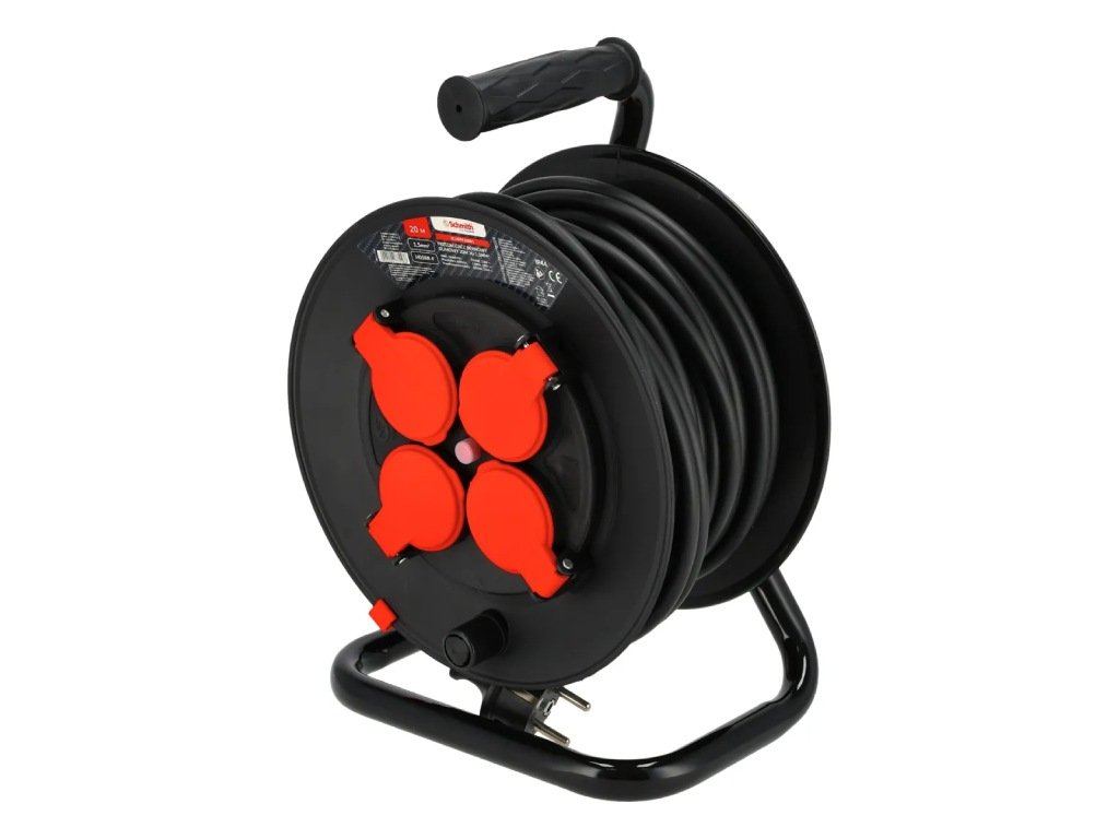 Gumový plášť kábla s ochranou IP44 zaručuje vysokú odolnosť proti vode a prachu, čo robí tento predlžovací kábel ideálnym riešením pre prácu v náročnom prostredí. Predlžovací kábel na bubne je vybavený štyrmi zásuvkami s uzemnením, ktoré zvyšujú jeho funkčnosť a všestrannosť.