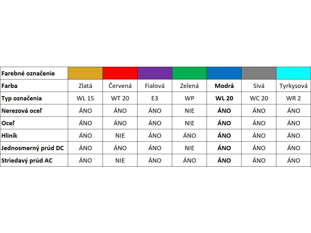 Modrá WL 20 wolfrámová elektróda 2,4 mm x 175 mm sa prioritne používa na TIG zváranie nelegovaných a vysoko legovaných ocelí, hliníka, titánu, niklu, medi a horčíkových zliatin.