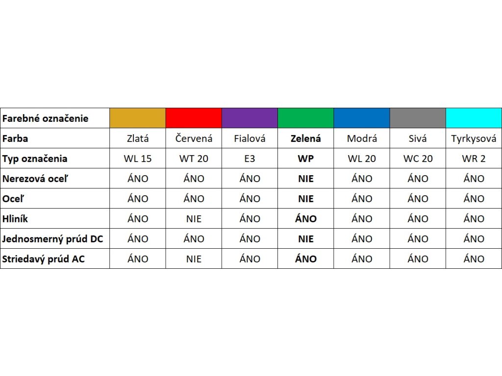 Zelená WP wolfrámová elektróda 3,2 mm x 175 mm je neobohatená TIG elektróda - čistý Volfrám. Používaja sa najmä pri zváraní hliníkových zliatín striedavým prúdom AC.