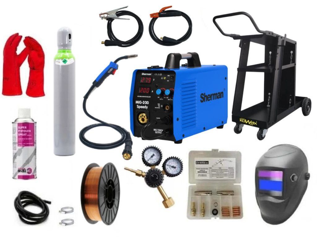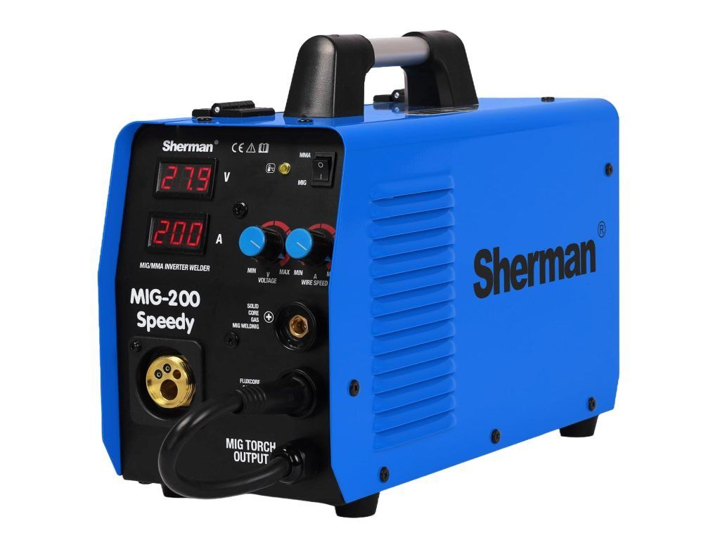 Giga set invertorová zváračka CO2 SHERMAN MIG 200 SPEEDY určená na zváranie ocele a neželezných kovov. Možnosť zvárania drôtom (MIG/MAG) a elektródou (MMA). Pri zmene polarizácie je možné zvárať aj trubičkovým (rúrkovým) drôtom bez použitia plynu.