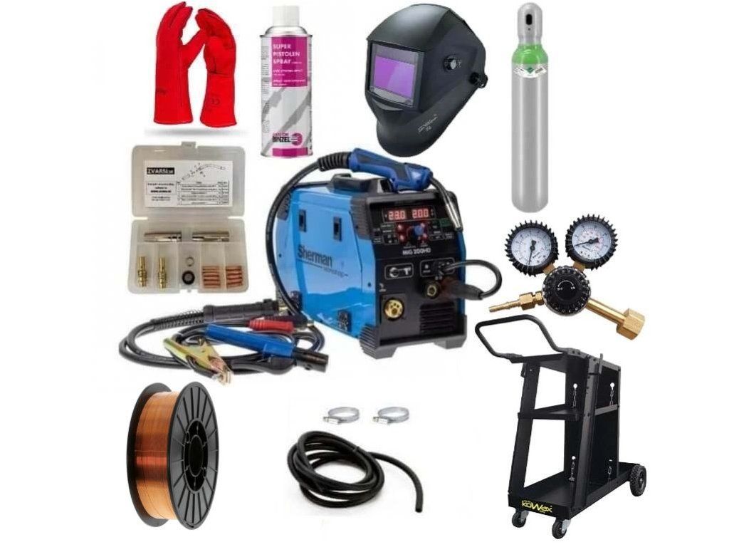Giga set zváračka MIG 200HD Sherman + príslušenstvo určený na zváranie ocele a neželezných kovov. Možnosť zvárania drôtom (MIG/MAG), elektródou (MMA) a netaviacou sa elektródou (TIG škrtom). Pri zmene polarizácie je možné zvárať aj trubičkovým (rúrkovým) drôtom bez použitia plynu.