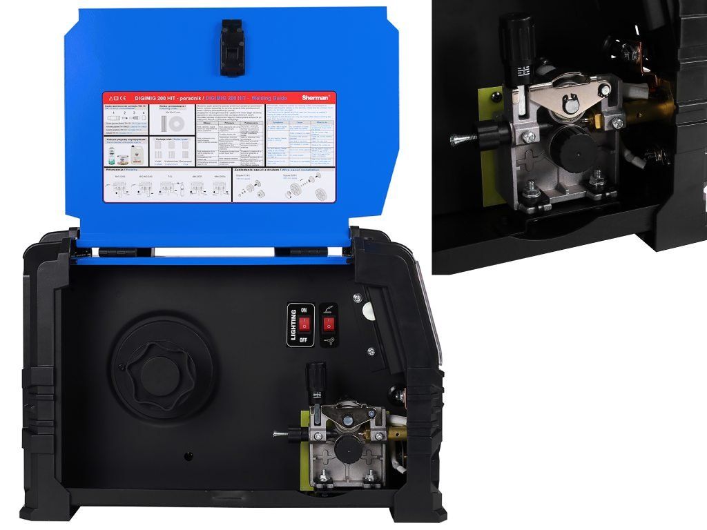 Zváračka má taktiež osvetlenie priestoru podávača, ktoré uľahčuje nasadzovanie drôtu a výmenu kladiek, čím zvyšuje komfort a presnosť obsluhy zariadenia.