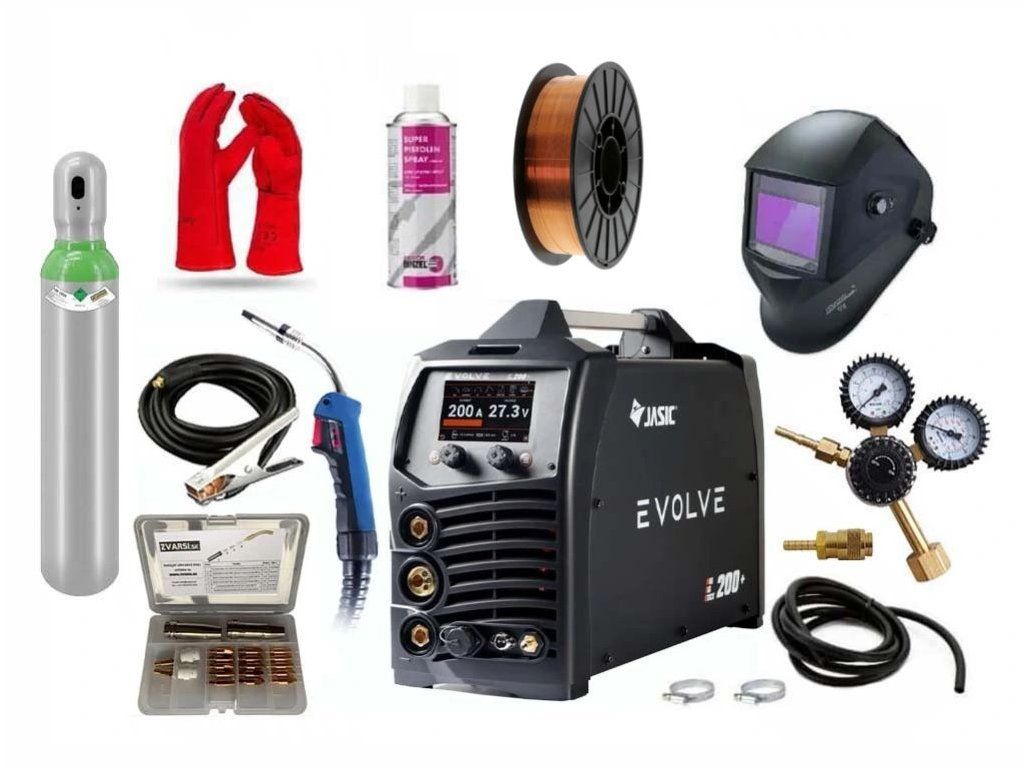 Mega set - Zváračka pulzná EVOLVE MIG JASIC 200P N2D2 podporuje Double Pulse MIG, HF TIG, Lift TIG a ďalšie na zváranie rôznych materiálov. Zvárací invertor JASIC je multifunkčné zariadenie určené na zváranie metódami MIG/MAG, MMA a TIG. Jeho pokročilé funkcie a moderné technológie umožňujú efektívne zváranie rôznych materiálov s vysokou kvalitou zvarov.