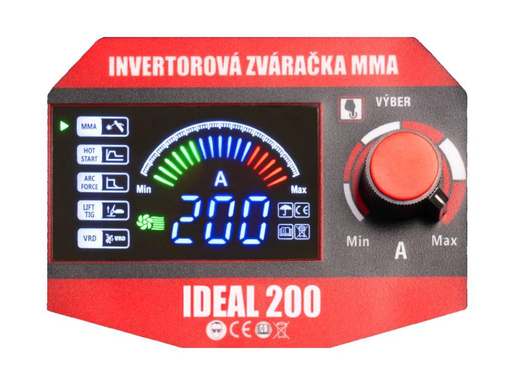 - ANTI STICK – Zníženie prúdu pri skrate, aby sa zabránilo prilepeniu elektródy.