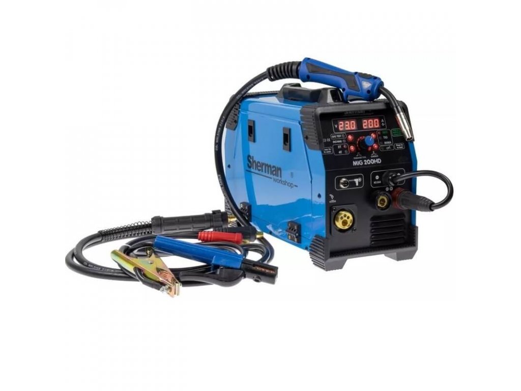 Zváračka MIG 200HD Sherman + káble + horák 3m určená na zváranie ocele a neželezných kovov. Možnosť zvárania drôtom (MIG/MAG), elektródou (MMA) a netaviacou sa elektródou (TIG škrtom). Pri zmene polarizácie je možné zvárať aj trubičkovým (rúrkovým) drôtom bez použitia plynu.